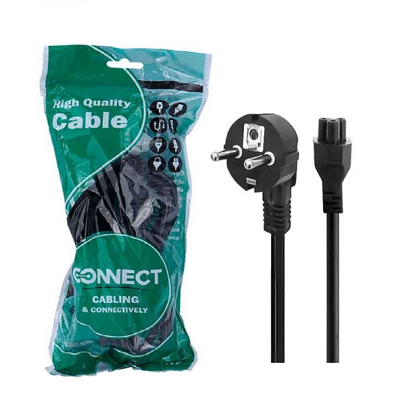 کابل 3 پین لپ تاپی محصول Connect با طول 1.5 متر مناسب آداپتور لپ تاپ و برخی از دستگاههای دیجیتالی، که کیفیت قابل قبولی دارد و در بسته بندی شکیل به بازار عرضه شده است.