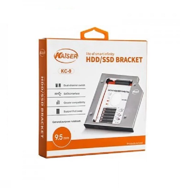 براکت هارد اینترنال Kaiser مدل 9.5 HDD Caddy جهت نصب هارد دیسک اضافی در لپتاپها کاربرد دارد. این براکت با نصب آسان، قابلیت تبدیل رایتر لپ تاپ به هارد را داشته و از SSD و HDD پشتیبانی می کند. وجود پیچ و پیچ گوشتی مناسب در بستهبندی، امکان نصب آسان را فراهم کرده است.