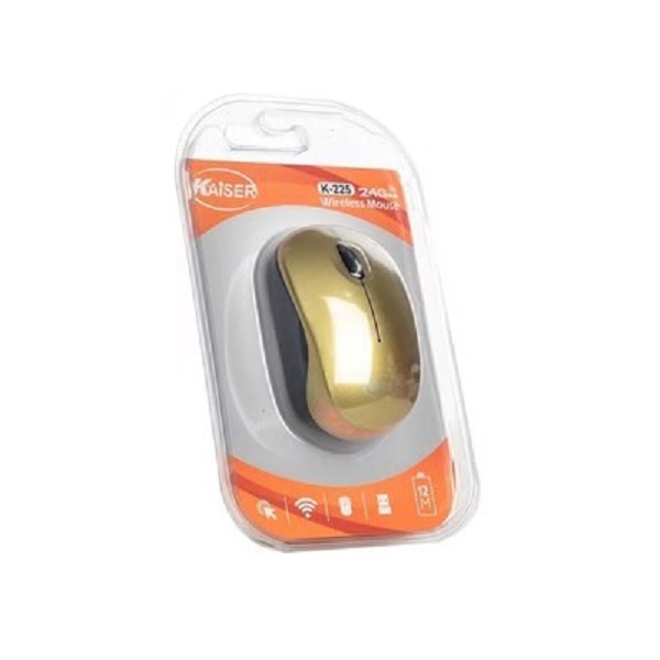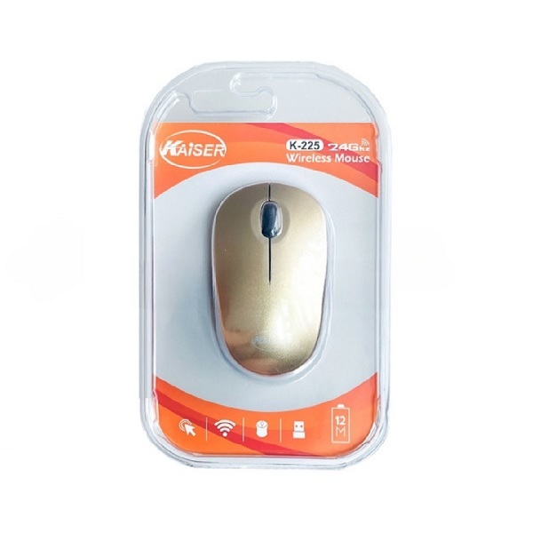 موس بی سیم طلایی رنگ کایزر مدل K-225 از جنس پلاستیک با کیفیت ABS ساخته شده و به همراه طراحی ارگونومیک جهت جلوگیری از خستگی دست کاربران، انتخاب مناسبی برای کارهای روزمره می باشد. اتصال این موس از طریق دانگل USB به کامپیوتر و لپ تاپ به صورت Plug and Play انجام می شود. این موس از دقت 1600dpi برخوردار بوده و دارای حسگر اپتیکال می باشد.