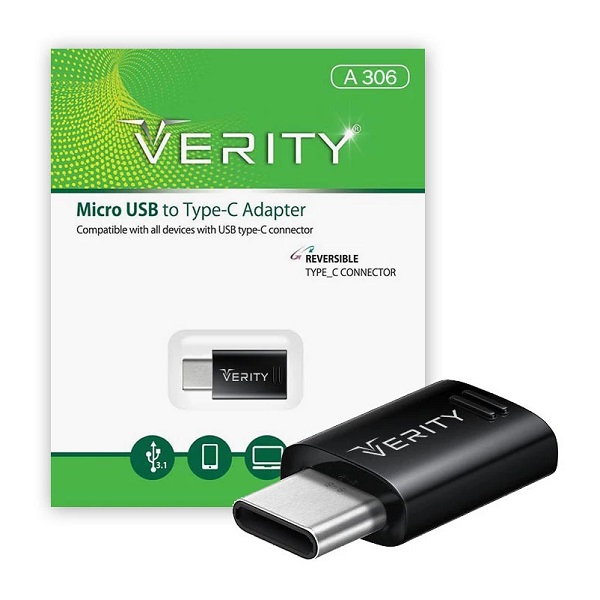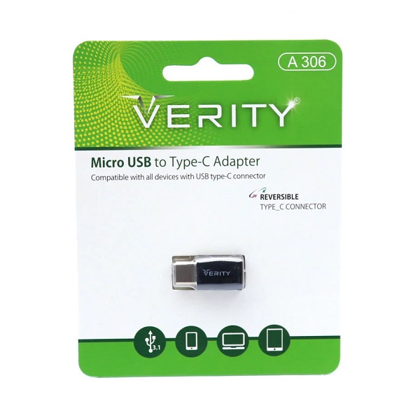 مبدل microUSB به Type-C وریتی مدل A306 محصولی کاربردی است که دارای ورودی میکرو یو اس بی ( micro-usb ) و خروجی تایپ سی (Type-C) می باشد. با این تبدیل، اتصال کابل های microUSB به گوشی های دارای سوکت Type-C امکان پذیر است.