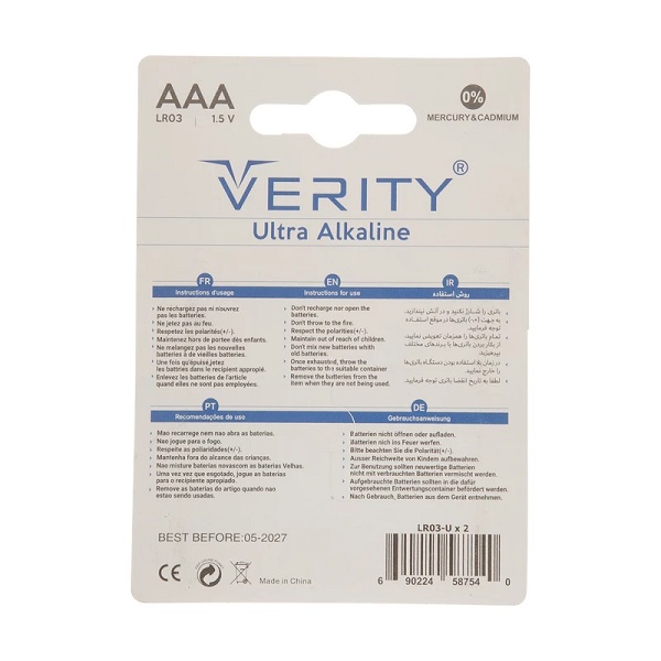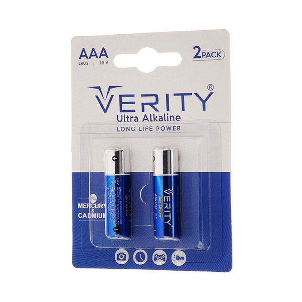 امروزه باتریها در اکثر وسایل زندگی، از لوازم خانگی ساده گرفته تا دستگاههای هوشمند، کاربرد دارند. این مدل باتریهای نیم قلمی Verity بهصورت بستههای 2 عددی تولید شده است. تکنولوژی ساخت این نوع باتری از نوع آلکالاین است. باتریهای آلکالاین طول عمر زیادی داشته و تا شش برابر بیشتر از باتریهای معمولی عمر میکنند.